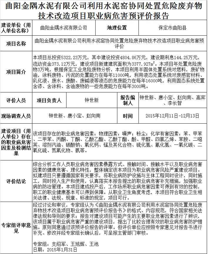 曲阳金隅水泥有限公司利用水泥窑协同处置危险废弃物技术改造项目职业病危害预评价